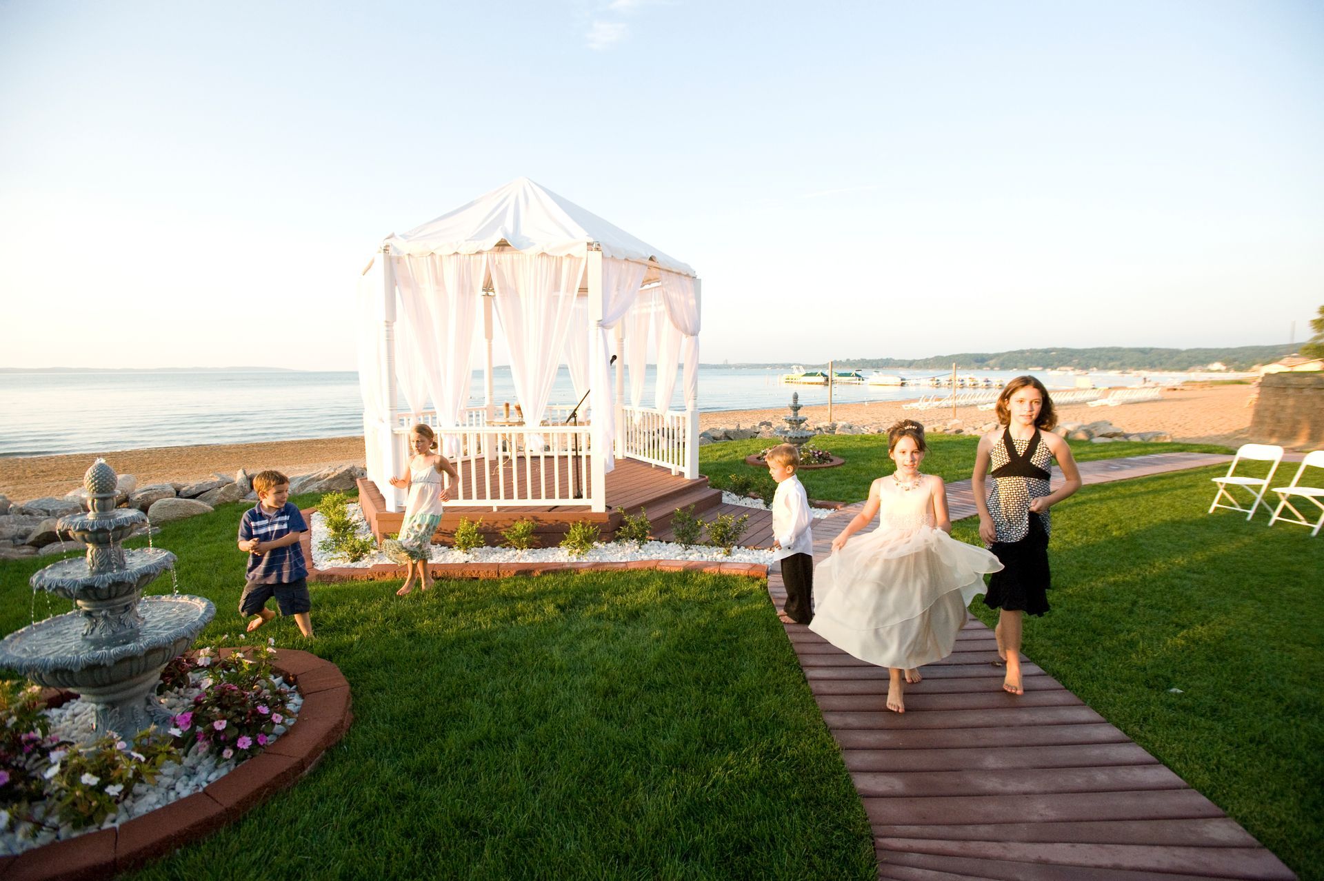 If you are looking for that perfect romantic beachfront location to say your “I Do’s”, look no further. This stunning venue offers a romantic setting featuring East Grand Traverse Bay as your backdrop. Packages can be designed to accommodate your needs for up to 50 people and start at $750.00. Our dedicated staff will assist with set up and tear down. Additionally the Parkshore Resort can host your event dinners and hotel accommodations.